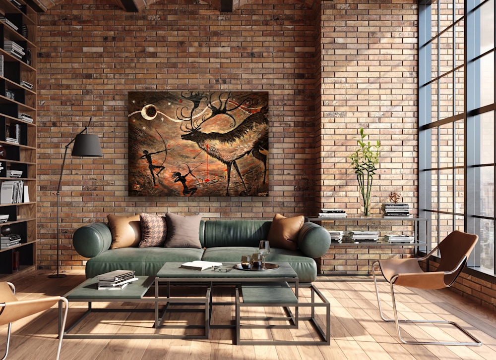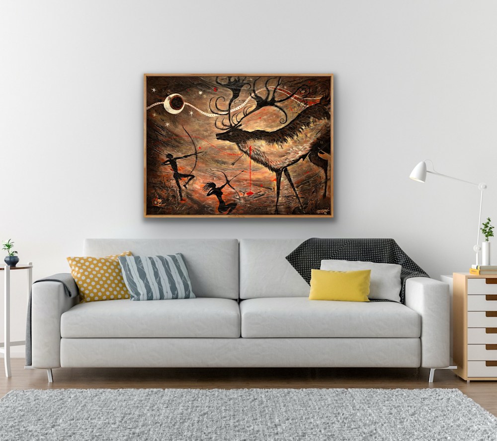 The artist’s technique of blending abstract forms with realistic elements results in a piece that feels timeless, reflective of ancient cave paintings while maintaining a modern sensibility. The swirling patterns surrounding the stag’s antlers evoke a mystical aura, suggesting a connection to nature that transcends mere survival.