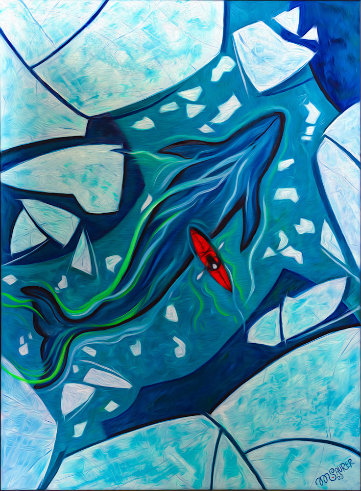 The strength of this piece lies in its ability to convey a powerful narrative of harmony and contrast between the majestic whale and the fragile, geometric ice. The artist has skillfully employed a semi-abstract style that allows for an emotive interpretation of the natural world, inviting the viewer to explore layers of movement and energy encapsulated in the water's flow and the forms of ice. This is further enhanced by the rhythmic pattern of the ice shapes, which contrasts with the organic curves of the whale and the fluid path of the kayak.