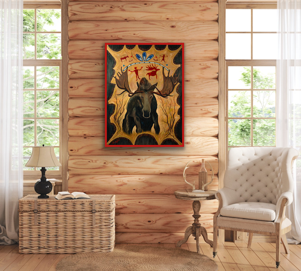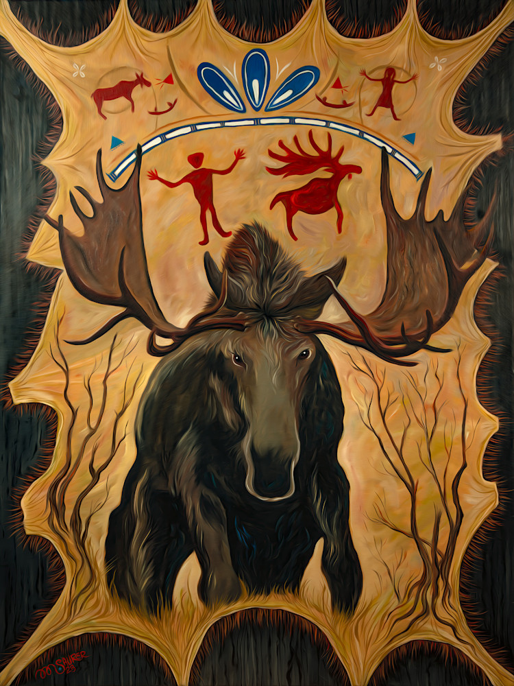This painting is a vivid and striking depiction of a moose set against a dynamic backdrop. The central focus is the moose with its impressive antlers, which are intricately detailed and expressive. The artist has chosen earthy tones, which lend the piece an organic and grounded feel. Surrounding the moose are stylized human and animal figures reminiscent of ancient petroglyphs or cave paintings, adding a layer of historical and cultural depth. The composition is framed with a decorative border that enhances the overall impact.