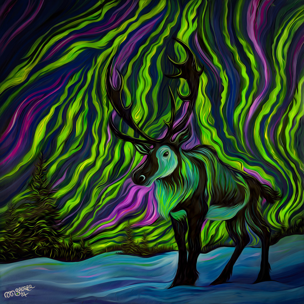 The reindeer basks in the color-soaked light of the Auroras.  36x36 in framed oil on canvas.