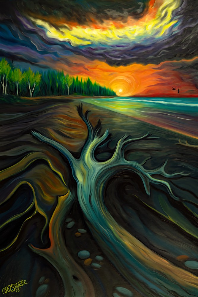 A vibrant and dynamic depiction of a dramatic Lake Superior sunset near Port Wing Wisconsin. The foreground is dominated by twisted, gnarled driftwood that reaches out across the sandy beach with an almost lifelike grace. The use of bold, swirling strokes infuses the wood with movement and energy, drawing the viewer's eye inward. The background displays a dense, lush forest in rich greens, contrasting beautifully with the fiery hues of the sunset. The sky is a swirling tapestry of dark storm clouds gradually giving way to bright yellows, oranges, and reds, which reflect on the tranquil ocean. Two birds in flight add a sense of freedom and tranquility to the composition.